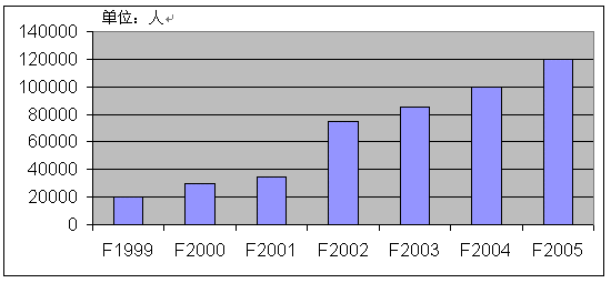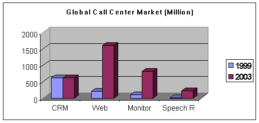 。。在1999年,全球呼叫中心應(yīng)用軟件的市場總值為29億美元,到2003年這一數(shù)字將增長近三倍,達到85億美元。這一增長主要來源于對基于互聯(lián)網(wǎng)呼叫應(yīng)用軟件以及呼叫監(jiān)控解決方案的需求。Data-monitor 市場分析專家在1999年針對呼叫中心軟件市場進行調(diào)研,具體數(shù)字詳見下表: