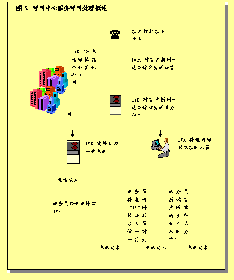 圖3概述了呼叫中心服務(wù)呼叫處理過程。描述了進(jìn)入呼叫中心系統(tǒng)的各種呼叫如何完成處理過程,或者由真人代表完成,或者是通過IVR技術(shù)完成。