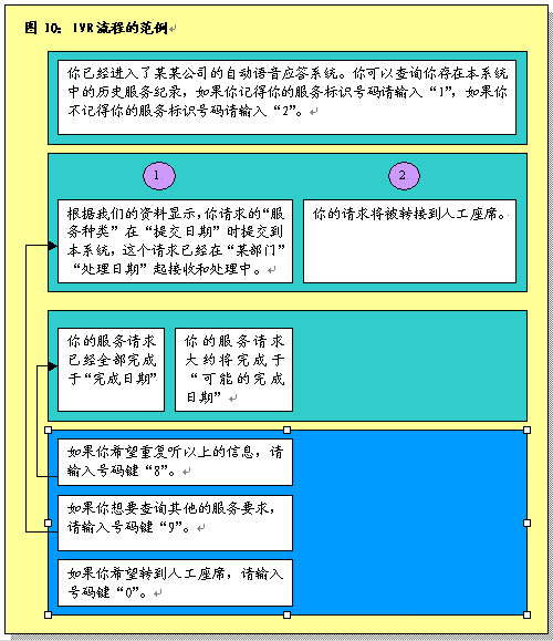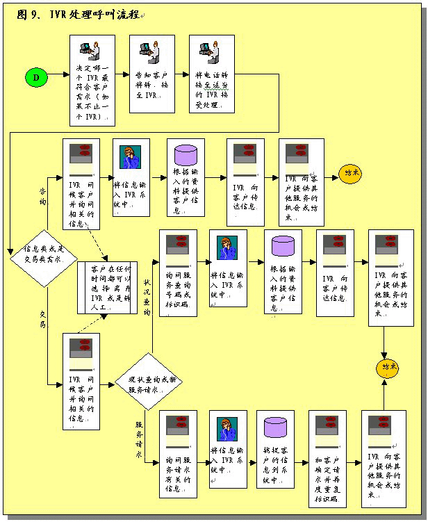 根據(jù)呼叫處理部分所作的說明,在完成初次聯(lián)絡(luò)過程之后,服務(wù)代表將確定呼叫者的需要。之后服務(wù)代表將協(xié)助呼叫者或者使其選擇IVR系統(tǒng),該系統(tǒng)通過自動(dòng)為這些請(qǐng)求錄音提供相關(guān)的信息和服務(wù)。服務(wù)代表將接受培訓(xùn)識(shí)別哪些交易服務(wù)和信息服務(wù)可以通過IVR進(jìn)行,這樣他們可以使呼叫者選擇自我服務(wù)。圖9圖示了用這一辦法處理呼叫的過程。