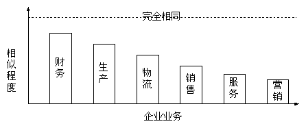 很顯然,企業(yè)間業(yè)務(wù)的相似程度越高,采用商用軟件的有效率越高,企業(yè)在采用商用軟件的時(shí)候軟件的客戶化定制就越少,實(shí)施的成功率越高。財(cái)務(wù)軟件是目前商用軟件通用最有效的企業(yè)管理軟件就是明證。從圖中可以看出前面的幾種業(yè)務(wù),是 傳統(tǒng)ERP軟件支持的功能;而后面的銷(xiāo)售、服務(wù)和市場(chǎng)是目前CRM軟件所要實(shí)現(xiàn)的功能。如果說(shuō),企業(yè)采用現(xiàn)有的ERP商品套件來(lái)滿足企業(yè)運(yùn)營(yíng)管理的需要還需要30%的客戶化工作,那么如果采用商用的CRM軟件,軟件廠商提供的軟件要應(yīng)用于企業(yè),就需要更多的客戶化工作,這個(gè)比例幾乎接近于企業(yè)自己開(kāi)發(fā)。