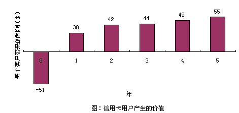 以信用卡服務(wù)為例,爭(zhēng)取一個(gè)新的用戶平均要51美圓,用于廣告、推銷和開戶等開支。用戶開始時(shí)花錢很少,但為公司帶來(lái)一定的利潤(rùn)。但如果用戶繼續(xù)使用到第二年,就會(huì)為公司帶來(lái)更多的經(jīng)濟(jì)效益,因?yàn)楣九c客戶之間的信任和客戶對(duì)公司的滿意,致使客戶更多地通過(guò)信用卡消費(fèi)。(圖:"信用卡用戶產(chǎn)生的價(jià)值")用戶貢獻(xiàn)在增加,公司的運(yùn)作費(fèi)用卻在不斷減低。信用卡公司可以不斷減少對(duì)客戶信用的審核時(shí)間。保持長(zhǎng)期的客戶關(guān)系,還可以減少?gòu)V告支出,客戶本身就是一個(gè)免費(fèi)的廣告資源。很多人在消費(fèi)前喜歡聽取朋友的意見(jiàn),覺(jué)得比廣告更可信。