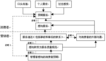 柏拉·所羅門、塞登爾和貝利給出了一種服務(wù)質(zhì)量模式,其重要一點(diǎn)是對服務(wù)提供者提供預(yù)期服務(wù)質(zhì)量的主要要求。下圖表明招致服務(wù)失敗的5個差距: