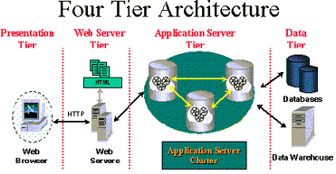 四層架構(gòu)的四層是指Presentation Tier(表示層)、Web Server Tier(Web服務(wù)器層)、 Application Server Tier(應(yīng)用服務(wù)器層)和 Data Tier(數(shù)據(jù)層)四層,其關(guān)系如下圖所示。