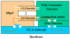 所有來自客戶端的請求(瀏覽器和Applet)都首先發(fā)送給Web Server(HTTP Daemon),然后由httpd啟動相應(yīng)的CGI/servlet擴(kuò)展,CGI/servlet模塊僅對上傳的數(shù)據(jù)進(jìn)行簡單的檢查和打包工作然后就傳給Web Connector Daemon,CGI/servlet模塊本身并不處理連接,它是以一種無連接的方式轉(zhuǎn)發(fā)一個請求再回送應(yīng)答。連接的維持和記錄由Web Connector Daemon建立起連接記錄表來完成。