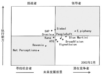 E.piphany依靠其分析能力和個性化方面的優(yōu)勢,仍然是該市場的領(lǐng)導(dǎo)者。但是其領(lǐng)先地位開始受到了強有力的挑戰(zhàn)。其中,Siebel對其領(lǐng)先地位構(gòu)成很大的威脅,正在逐步邁入該市場的領(lǐng)導(dǎo)者行列。Blue Martini Software由于受到其零售和生產(chǎn)能力方面的限制,目前依然稍稍遜色于E.piphany。