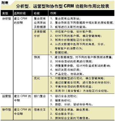 在上述目標(biāo)下,有什么類(lèi)型的產(chǎn)品可供選擇呢?對(duì)銀行來(lái)說(shuō),有分析型、運(yùn)營(yíng)型和協(xié)作型3類(lèi)CRM,而這3類(lèi)CRM也有著很大差別,對(duì)于有不同需求的銀行需要有不同的選擇。下面詳細(xì)分析這3類(lèi)CRM。
