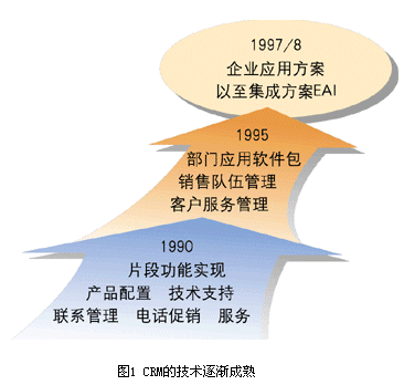 ----二是CRM的技術(shù)逐漸走向成熟(見(jiàn)圖1)。1990年左右,CRM方案只是片斷功能的實(shí)現(xiàn),到1995年以來(lái)、1997/8年以來(lái),逐漸出現(xiàn)了部門(mén)級(jí)應(yīng)用軟件包、企業(yè)級(jí)應(yīng)用方案。有些企業(yè)甚至已經(jīng)開(kāi)始關(guān)心自己原有的ERP系統(tǒng)與正在建設(shè)的CRM系統(tǒng)之間的集成問(wèn)題。