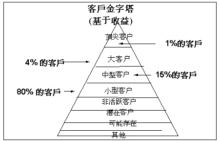 將數(shù)據(jù)以圖象化形式輸出,易于向你展示正在發(fā)生何事。簡(jiǎn)單如一個(gè)金字塔,其頂部(百分之一)表示盈利最高的頂尖客戶,下一層為大客戶(百分之四),然后是中型(百分之十五)和小客戶(百分之八十),最后是不活躍的、潛在的、可能存在的客戶及其它各種等等。