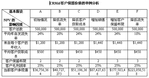 下表列出決定基本NPV的六個基本假設(shè)。其他方法也可計算出NPV,但這是CRM中最易使用的方法。使用該方法,不懂財務(wù)的經(jīng)理也能很容易看出CRM的影響,并能夠做出改變客戶營銷投入的決策。