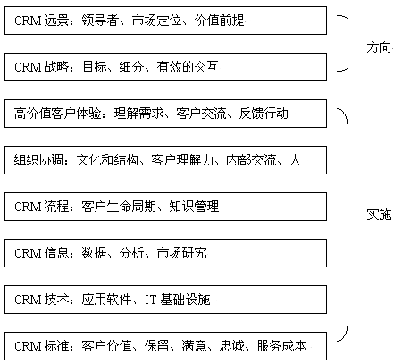 對于大多數(shù)公司而言,一個(gè)產(chǎn)品戰(zhàn)略很好理解。但是CRM戰(zhàn)略卻不太讓人理解。這是因?yàn)樵贑RM產(chǎn)業(yè)界、學(xué)術(shù)界對"CRM是什么"、"CRM戰(zhàn)略由什么組成"還沒有達(dá)成共識(shí)。因此,以下所闡述的CRM戰(zhàn)略并不一定勝人一籌,但我們會(huì)努力全面論述CRM戰(zhàn)略框架。我們認(rèn)為一個(gè)CRM戰(zhàn)略必須包括以下幾個(gè)內(nèi)容:定義價(jià)值前提、定義客戶戰(zhàn)略、企業(yè)變革計(jì)劃。