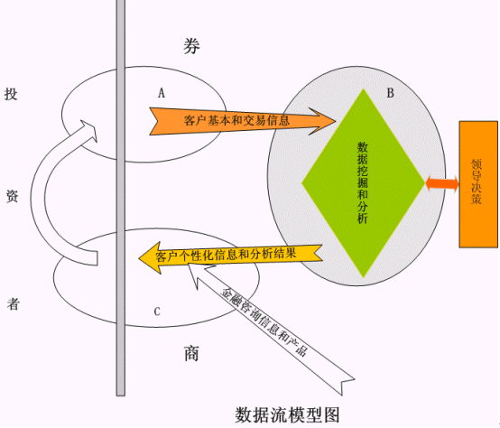 如數(shù)據(jù)流和服務(wù)模型圖所示,B模塊就是對客戶進(jìn)行數(shù)據(jù)分析和數(shù)據(jù)挖掘的模塊。這個模塊將會對領(lǐng)導(dǎo)決定支持和為下一步真正的為核心客戶提供更有針對行的服務(wù)提供基礎(chǔ)。