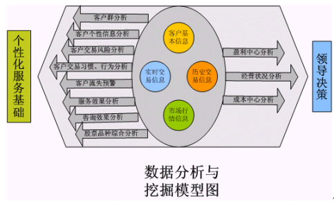 。。從上圖可以看出,在這個(gè)客戶(hù)信息數(shù)據(jù)分析模塊當(dāng)中,主要分析對(duì)象是客戶(hù)的基本信息、客戶(hù)的實(shí)時(shí)交易信息、客戶(hù)的歷史交易信息、客戶(hù)帳戶(hù)信息和市場(chǎng)行情信息等幾個(gè)處于孤島形狀的信息模塊。而得到的分析結(jié)果應(yīng)該包括如下幾個(gè)基本方面,以被為領(lǐng)導(dǎo)的決策和企業(yè)的業(yè)務(wù)流程服務(wù):