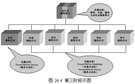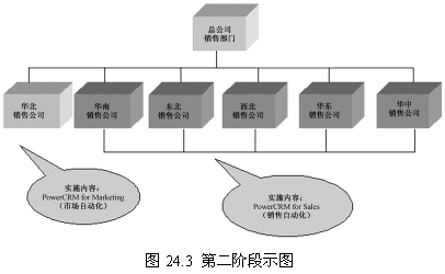 這一階段首先確立一個點(diǎn)(華北銷售公司),這個點(diǎn)的選擇要考慮多方面的因素,比如員工素質(zhì)、電腦應(yīng)用水平以及基礎(chǔ)設(shè)施等。第一階段目標(biāo)的實現(xiàn)對整個項目關(guān)系重大,是一個示范性的實施,對維持管理層和員工對CRM項目的信心具有重要的意義。