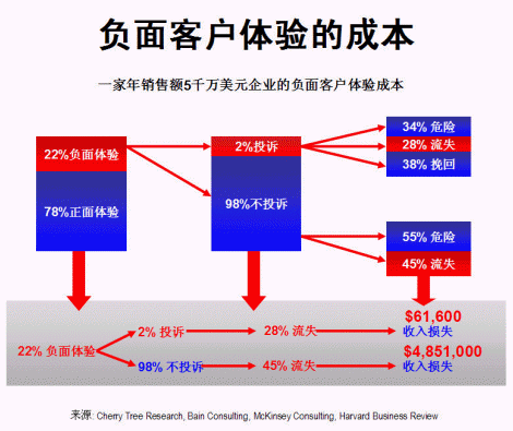 一家年銷售額五千萬(wàn)美元的企業(yè),假設(shè)正面客戶體驗(yàn)為78%,負(fù)面體驗(yàn)為22%,在所有負(fù)面體驗(yàn)中,只有2%的客戶投訴,其余98%大多數(shù)均不投訴,保持沉默(這與現(xiàn)實(shí)情況頗為吻合)。在2%投訴客戶中,有34%經(jīng)過處理仍然未能令客戶完全滿意,尚有流失的危險(xiǎn);28%的客戶在處理后依然流失,余下38%的客戶則感到滿意,繼續(xù)留下。對(duì)大部分(98%)沒有投訴的客戶,因公司對(duì)他們的不滿意并不知情,所以沒有采取行動(dòng),55%的客戶有隨時(shí)流失的危險(xiǎn),其余45%已經(jīng)流失。