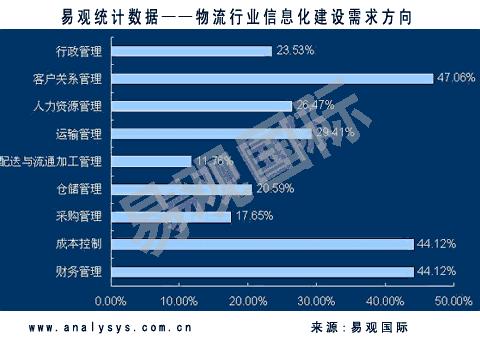 易觀國際《中國物流行業(yè)信息化年度綜合報告2006》數(shù)據(jù)統(tǒng)計,物流企業(yè)選擇管理信息化建設方向最迫切的需求是客戶關系管理,占到全部企業(yè)的47%以上。