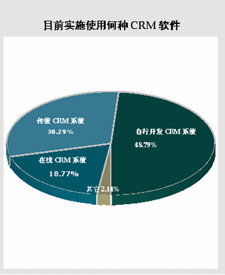 在選擇“已經(jīng)實施任一CRM軟件”的38.45%的被調(diào)查者中,有48.79%的CRM軟件使用者目前實施的是“自行開發(fā)CRM系統(tǒng)”,而選擇“傳統(tǒng)CRM系統(tǒng)”的為30.29%。雖然市場對on-demand CRM抱有極大的熱情,但從目前的情況,這種模式的實施率仍然很低,有18.77%的CRM用戶目前正在實施這種按需定制的模式。