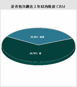 在選擇“尚未使用任一CRM軟件”的被調(diào)查者中,當(dāng)被問及基于現(xiàn)在的狀況,“是否有興趣在兩年以內(nèi)投資CRM”。有64.70%的被調(diào)查者選擇有興趣在兩年內(nèi)投資CRM軟件,而選擇沒有興趣在兩年內(nèi)投資CRM軟件的只占35.30%。盡管現(xiàn)在實際使用CRM軟件的用戶所占比例還不甚理想,但市場前景還是非?春,大部分公司具有實施CRM軟件的需求。