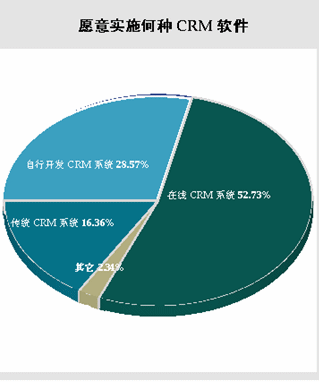 在選擇“愿意在兩年內(nèi)實施任一CRM軟件”的64.70%的被調(diào)查者中,他們對CRM軟件的選擇情況也有所差別。其中,52.73%的被調(diào)查者選擇“有興趣在兩年內(nèi)投資on-demand CRM軟件,或在線CRM軟件”;也有28.57%的被調(diào)查者選擇自行開發(fā)CRM軟件;相比于前面兩種類型,被調(diào)查者對傳統(tǒng)CRM軟件的需求則處于一個較低的水平,有16.36%的被調(diào)查者仍然選擇有興趣在兩年投資傳統(tǒng)的CRM軟件。雖然ASP的模式在中國市場上的認(rèn)知度仍然有限,但是市場對on-demand CRM,這種近來引人關(guān)注的實施方式抱有極大的熱情。