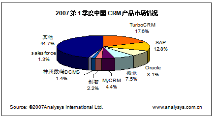 易觀國際研究表明,中國CRM產品市場2007年第1季度總體市場規(guī)模達到0.79億人民幣,同比季度增長率達達到13%,體現(xiàn)了穩(wěn)健增長的趨勢。具體廠商方面,TurboCRM,SAP,Oracle(甲骨文)位居領先地位。
