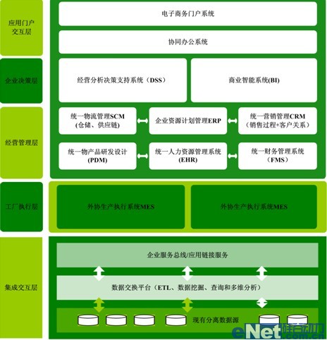 根據(jù)企業(yè)管理發(fā)展戰(zhàn)略及目標(biāo),需要考慮建設(shè)“集成化數(shù)字管控制造系統(tǒng)”,涵蓋企業(yè)決策層、企業(yè)經(jīng)營管理層。根據(jù)整體業(yè)務(wù)模式,企業(yè)經(jīng)營管理層又可以進(jìn)一步分解為公司管理層和工廠執(zhí)行層;從信息化戰(zhàn)略支撐角度可以分解為企業(yè)門戶交互層、應(yīng)用系統(tǒng)層、應(yīng)用集成層和網(wǎng)絡(luò)支撐層。實現(xiàn)企業(yè)信息流、資金流、物流、商物流的高度集成、統(tǒng)一,為企業(yè)生產(chǎn)、經(jīng)營提供強有力的信息化支撐。