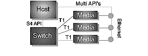 使用TAPI、S.100和H.100規(guī)格,服務(wù)點(diǎn)的主機(jī)、交換和媒體資源能有效的集成到一個(gè)交換平臺(tái)中(見(jiàn)圖三)早期的集成結(jié)構(gòu)受非冗余備份交換的限制,不能滿足服務(wù)供應(yīng)商的需求。S.100和TAPI也不能滿足諸如處理器冗余備份和資源分布的要求,應(yīng)用于PC平臺(tái)的H.100標(biāo)準(zhǔn)也不支持“無(wú)信號(hào)點(diǎn)的故障“(no signal point of failure)的載體需求。而Sigma計(jì)劃的支持全標(biāo)準(zhǔn)兼容性克服了這些限制。
