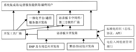 。。CTI板卡是插在計算機總線上,用于電話接口及有關處理的計算機板卡,又稱“語音卡”。語音卡是CTI系統(tǒng)中關鍵的硬件設備,它使得計算機和電話快速、緊密地結(jié)合在一起。CTI板卡不僅是一種產(chǎn)品,它已經(jīng)發(fā)展成為了一個產(chǎn)業(yè)。CTI板卡的產(chǎn)業(yè)鏈條所涉及的廠商和組織,如圖所示。