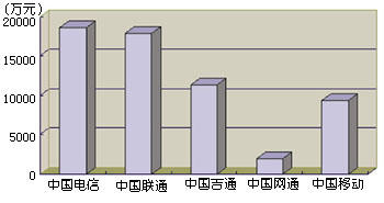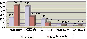 通過引入IP電話業(yè)務,我國電信市場已經(jīng)形成了以中國電信、中國聯(lián)通、中國移動、中國吉通和中國網(wǎng)通等五大電信運營公司為主體的新格局。他們各自的業(yè)務范圍不盡相同,但IP電話是他們相同的業(yè)務之一,所以這一市場相互之間的競爭較為激烈。圖1和圖2分別表示這五大運營商在2000年上半年IP電話的話務量和收入。從圖中可以看出,他們在我國IP電話市場上所占據(jù)的地位和角色。
