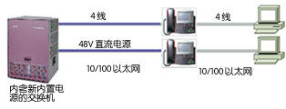 第三種方式,是擴(kuò)充局域網(wǎng)交換機(jī)的功能,在局域網(wǎng)交換機(jī)的接口模塊上增加特殊部件,實(shí)現(xiàn)內(nèi)置供電功能(Inline Power)。如下圖: