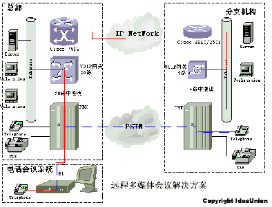 圖中紅色實線表示通過IP網(wǎng)絡傳輸語音的線路,藍色虛線表示通過PSTN傳輸語音的線路。由于通過IP網(wǎng)絡沒有使用額外的長途線路,所以降低了遠程會議系統(tǒng)的運行成本。同時VoIP傳輸系統(tǒng)支持普通的長途電話呼叫,為客戶節(jié)省長途電話開支。