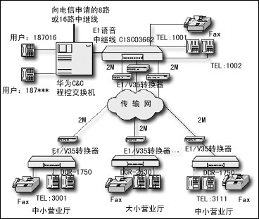 市聯(lián)通通過在Cisco 3662路由器上配置一個(gè)NM-HDV-1E1-30E語(yǔ)音中繼模塊,通過75歐姆同軸電纜與華為程控交換機(jī)的E1接口板相連,提供30路話音,該路由器用作語(yǔ)音網(wǎng)關(guān)。各網(wǎng)點(diǎn)配置神州數(shù)碼路由器,配置MR-VIC-2FXS或MR-NM-4FXS語(yǔ)音模塊,提供多路語(yǔ)音。