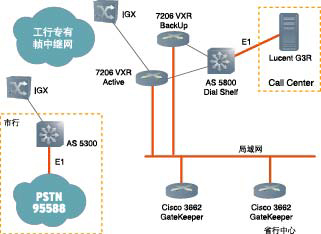 AS 5800 Dial Shelf上的E1接口直接連接客戶服務(wù)中心的Lucent公司G3R交換機。市行的語音網(wǎng)關(guān)Cisco AS 5300同樣通過高速串口接入幀中繼網(wǎng)絡(luò),與本地網(wǎng)絡(luò)完全隔離。市行申請的95588數(shù)字中繼線路(多采用ISDN