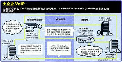 Lehman Brothers利用Cisco CallManager IP PBX向全球的雇員提供語音服務。該公司的IP PBX位于公司在曼哈頓和新澤西城的冗余數(shù)據(jù)中心內。公司從2001年初先期部署了容量為50部電話的VoIP網(wǎng)絡。該系統(tǒng)在當年年中時已經增容至1000個用戶。目前,這套VoIP網(wǎng)絡已經增加至8000個IP電話,用戶遍及紐約地區(qū)、英國和日本。該公司負責網(wǎng)絡服務的副總裁John
