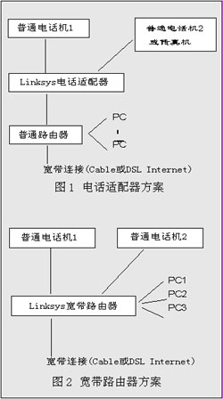利用電話適配器和寬帶路由器實現VoIP服務提供以及與PC的連接,分別如圖1和圖2所示。