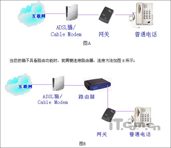 網(wǎng)關(guān)聯(lián)接至RJ45網(wǎng)線,普通電話機(jī)聯(lián)接在PHONE端口,該網(wǎng)關(guān)可通過市話線路或網(wǎng)絡(luò)撥打電話,原有市話線聯(lián)接在PSTN口上,直撥號(hào)碼時(shí)為通過網(wǎng)絡(luò)撥打,加前置碼#0*通過原有市話線撥打,如停電,所有電話均自動(dòng)從原有市話線路撥出。