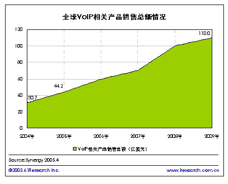艾瑞市場咨詢(iResearch)根據(jù)Synergy的數(shù)據(jù)整理顯示,隨著VoIP市場的開發(fā),企業(yè)用戶對(duì)VoIP的接受度增加,在2004年VoIP相關(guān)產(chǎn)品的銷售總額達(dá)到了30.7億美元,預(yù)計(jì)在2005年可達(dá)到44.2億美元,2009年將突破110億美元。