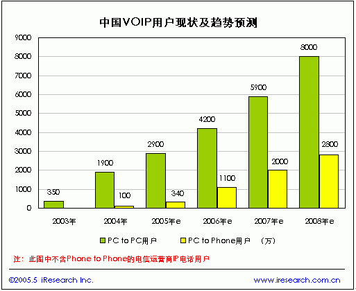 中國VOIP市場上PC to PC的VOIP電話主要是通過即時通訊軟件和語音聊天室來實現(xiàn)的,目前這部分服務(wù)絕大多數(shù)是免費的,尚未給服務(wù)公司帶來直接的經(jīng)濟收入。根據(jù)iResearch的統(tǒng)計數(shù)據(jù),2004年中國PC to PC的VOIP電話用戶達到1900萬,2005年有望達到2900萬。由于信息產(chǎn)業(yè)部在2003年2月發(fā)布的《電信業(yè)務(wù)分類目錄》中規(guī)定IP電話屬于第一類基礎(chǔ)電信業(yè)務(wù),但“IP電話業(yè)務(wù)在此特指由電話網(wǎng)絡(luò)和IP網(wǎng)絡(luò)共同提供的Phone-Phone以及PC-Phone的電話業(yè)務(wù)”,這與目前虛擬運營的Phone to Phone 、PC to Phone的寬帶電話略有不同,盡管如此這一規(guī)定對提供Phone to Phone 和PC to Phone的非電信運營商有著非常大的制約,目前在我國提供“到電話”的VOIP服務(wù)除部分基礎(chǔ)電信運營商試驗外多為暗中操作,存在較大的風(fēng)險不能通過大規(guī)模的市場推廣來迅速吸引用戶,因此PC to Phone的VOIP電話用戶增長速度將相對平穩(wěn),據(jù)iResearch預(yù)測,2008年中國的PC to Phone的VOIP電話用戶將達到2800萬戶。