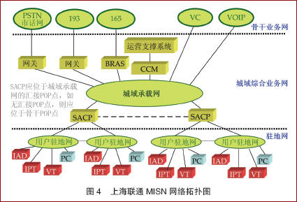 上海聯(lián)通MISN由5個部分組成(見圖4):(1)業(yè)務(wù)接入控制設(shè)備(SACP)。從用戶駐地網(wǎng)到城域網(wǎng)和骨務(wù)都必須通過SACP接的接入認(rèn)證、業(yè)務(wù)接入控制、網(wǎng)絡(luò)資源管理和服務(wù)質(zhì)量控制等。(2)呼叫管理控制模塊(CCM)。該模塊負(fù)責(zé)對用戶注冊的管理;通過SACP對業(yè)務(wù)接入進(jìn)行認(rèn)證和控制;與骨干業(yè)務(wù)網(wǎng)GK互通,完成各種業(yè)務(wù)的呼叫控制;與SACP一起采集計費(fèi)信息;負(fù)責(zé)控制語音和視頻媒體流的接入。(3)業(yè)務(wù)網(wǎng)關(guān)。聯(lián)通MISN是基于IP的分組網(wǎng),與基于電路交換的193長途電話骨干網(wǎng)和本地PSTN市話網(wǎng)互通時,由于媒體層面和控制信令層面都不同,因此,需要通過網(wǎng)關(guān)進(jìn)行互通。(4)BRAS設(shè)備。負(fù)責(zé)將互聯(lián)網(wǎng)接入到165網(wǎng)。(5)業(yè)務(wù)運(yùn)營支撐系統(tǒng)。該系統(tǒng)包括維護(hù)網(wǎng)管系統(tǒng)、用戶終端管理系統(tǒng)、用戶管理(業(yè)務(wù)受理、用戶信息管理、用戶業(yè)務(wù)授權(quán)與認(rèn)證)以及本地MISN的計費(fèi)/營賬系統(tǒng),其對上的接口是各骨干業(yè)務(wù)網(wǎng)的運(yùn)維支撐系統(tǒng)。