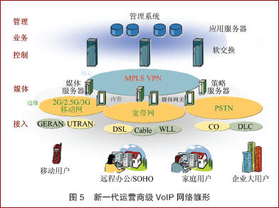 隨著以軟交換和MPLS/VPN兩項技術(shù)為核心的下一代網(wǎng)絡(luò)技術(shù)的不斷成熟和發(fā)展,將構(gòu)筑起新一代運(yùn)營商級的VoIP網(wǎng)絡(luò)雛形,如圖5所示。
