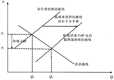 與傳統(tǒng)以電路交換為主的電話(huà)網(wǎng)相比,分組交換技術(shù)使得提供IP電話(huà)或VoIP電話(huà)所需的交換設(shè)備數(shù)量大大減少,而且部分提供IP電話(huà)或VoIP電話(huà)的運(yùn)營(yíng)商并沒(méi)有鋪設(shè)上下行用戶(hù)端的“最后一公里”線(xiàn)路。由于沒(méi)有全程布網(wǎng),在網(wǎng)間結(jié)算費(fèi)較低甚至不結(jié)算的情況下,其運(yùn)營(yíng)成本自然遠(yuǎn)低于本地運(yùn)營(yíng)商,從而使其供給曲線(xiàn)與本地運(yùn)營(yíng)商的供給曲線(xiàn)相比向右下方偏移,因而有能力推出價(jià)格遠(yuǎn)低于傳統(tǒng)語(yǔ)音的IP電話(huà)或VoIP電話(huà),見(jiàn)圖2。