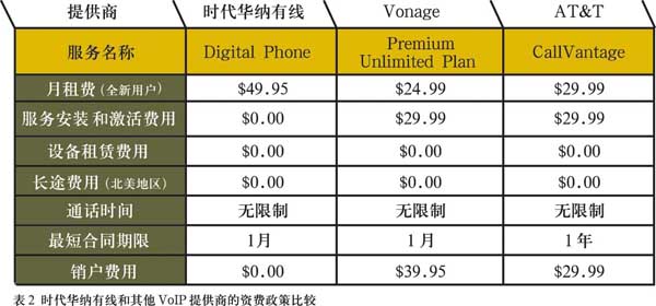 聲稱其1/3的有線電視用戶和一半以上的寬帶用戶訂購了其提供的VoIP服務(wù)。對于時(shí)代華納有線的全新VoIP用戶來說,開通并使用“數(shù)字電話”的費(fèi)用為每月49.95美元,那些時(shí)代華納有線的寬帶用戶只需44.95美元,如果用戶同時(shí)使用有線電視和寬帶,那么只需要39.95美元就可以了,時(shí)代華納有線為所有的服務(wù)(視頻、語音和數(shù)據(jù)接入)提供每月統(tǒng)一的賬單。此外用戶使用“數(shù)字電話”不需要簽訂長期合同,并享有30天的試用期,相對于其競爭對手來說賦予了用戶更多的自由。