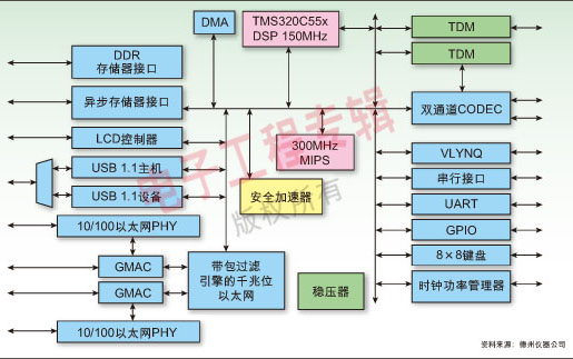 德州儀器(TI)公司最新的VoIP處理器設(shè)計(jì)用于確保在中小企業(yè)應(yīng)用中提供無延遲的語音服務(wù)。這種名為TNETV1051的處理器集成了1個(gè)300MHz的MIPS處理器、1個(gè)150MHz的C55x數(shù)字信號(hào)處理器(DSP)、2個(gè)千兆位以太網(wǎng)(GbE)媒體訪問控制器(MAC),以及1個(gè)片內(nèi)GbE交換器。