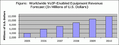 2006年11月?lián)y(tǒng)計(jì),全球VoIP設(shè)備銷(xiāo)售收入將從2005年的39.5億美元增長(zhǎng)到2010年的119億美元,年度復(fù)合增長(zhǎng)率為24.7%。如下圖所示。VoIP市場(chǎng)主要包括三個(gè)用戶(hù)群:用于企業(yè)的專(zhuān)用電話(huà)交換機(jī)(PBX),服務(wù)供應(yīng)商的基礎(chǔ)架構(gòu)以及住宅接入設(shè)備。