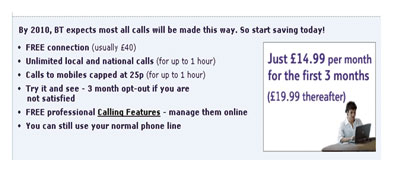 BTBroadbandTalk產(chǎn)品在其套餐使用費(fèi)中包括了一定時(shí)段的免費(fèi)國內(nèi)時(shí)長,國際長途按照通話量另外收取。VoIP通話所需要的寬帶電話設(shè)備由BT免費(fèi)提供給客戶。