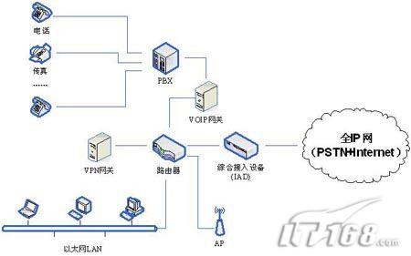 IP-PBX或者分組語音交換(PVX),以及綜合接入設(shè)備(IAD),從而取代傳統(tǒng)的PBX和終端。IAD通常支持基于DSL的業(yè)務(wù),因此部署時不需要多個物理線路的開銷,因為一條來自IAD的物理線路能夠支持多個虛擬電路。PVX可以處理各種分組話音服務(wù),而且可以避免升級和互操作性的問題。