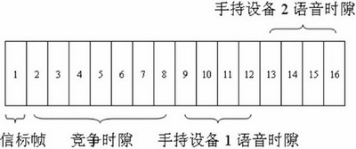 根據設計的特點,無線語音網關同手持設備間的無線網絡采用星型拓撲結構,無線語音網關作為無線個域網的協(xié)調器同手持設備進行信息交互。IEEE802.15.4MAC層分為使用信標幀和不使用信標幀兩種工作模式,本設計采用使用信標幀同步的超幀結構,由無線語音網關發(fā)送信標幀同步無線手持設備的數據傳輸。本設計中超幀長30ms,等分為16個時隙,每個時隙為1.875ms。信標幀在時隙1發(fā)送,時隙2到時隙8為競爭時隙,使用時隙CSMA-CA算法傳輸命令幀和應答幀。時隙9到時隙16固定分配給兩個手持設備作為上下行語音數據通道。上下行各兩個時隙的分配可以滿足經