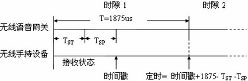 時隙1開始后,語音網關需要TSTms的時間將射頻芯片從空閑狀態(tài)轉換為發(fā)送狀態(tài),當轉換為發(fā)送狀態(tài)后,預先存儲在射頻芯片發(fā)送RAM中的信標幀立即開始發(fā)送,手持設備上的射頻芯片在收到六個字節(jié)TSPms后自動鎖存一個當前時間timestamp(時間戳),