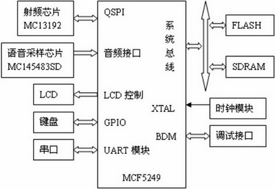 除內核外,完整的操作系統(tǒng)還需要編寫鍵盤,LCD,音頻驅動和射頻芯片驅動。音頻驅動采用Phlips I2S數據格式,設定采樣率為8KHz。射頻芯片驅動采用Freescale公司為MC13192提供的配套軟件模塊。