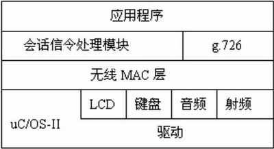操作系統(tǒng)之上是無線MAC層,該模塊針對語音無線傳輸的特點簡化實現了IEEE 802.15.4 協(xié)議MAC層功能。第三層為語音壓縮編解碼g.726模塊和無線網內部會話信令處理模塊。會話信令處理模塊負責處理來自無線語音網關的會話信令。最上層為應用層,實現用戶界面和通話過程控制。無線手持設備總統(tǒng)框架如圖6所示。