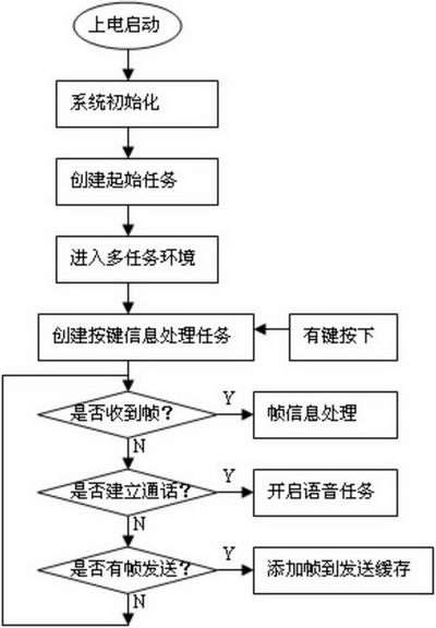 當手持設備上電啟動后,其工作流程如圖7示。首先進行的是系統(tǒng)的初始化,包括處理器初始化,操作系統(tǒng)mC/OS-II初始化,LCD,鍵盤,射頻模塊等的初始化。之后建立起始任務并通過OSStart()函數進入多任務環(huán)境。此時起始任務占用CPU資源,在起始任務中,建立按鍵信息處理任務并通過信號量機制掛起。然后判斷是否收到來自無線語音網關的幀,如果有,調用frame_deal()函數處理幀信息,在該函數中調用call_command_deal()完成無線網內部會話信令的處理。接著判斷通話是否建立,如果建立則創(chuàng)建語音任務,在語音進程中使能PCM編解碼芯片,并進行g.726壓縮編碼。最后判斷是否有幀需要發(fā)送給無線語音網關,如果有則把幀添加到發(fā)送緩存,等待發(fā)送時隙到來。這一過程完成以后重新跳到判斷是否收到來自無線語音網關的幀,重復以上過程。如果有鍵盤中斷,將會釋放一個信號量,該信號量將解掛按鍵信息處理任務。該任務對鍵盤輸入信息進行處理。