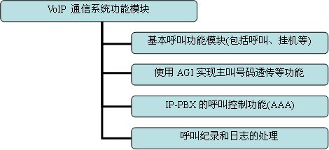 如果是基于純軟件的實現(xiàn)方案,Asterisk是構(gòu)建VoIP項目的核心,系統(tǒng)中所有與用戶呼叫有關(guān)的功能和管理都通過它來實現(xiàn),包括VoIP各種協(xié)議的互通和配置,以及各種呼叫設(shè)備的配置文件。本文檔所討論的VoIP通信系統(tǒng)基本功能如圖3-2所示,一般的Asterisk的任務(wù)包括了兩方面,一是與呼叫有關(guān)的,包括基本呼叫處理、主叫號碼透傳、呼叫紀錄和日志生成等,二是與呼叫控制有關(guān),即終端用戶的認證計費功能。